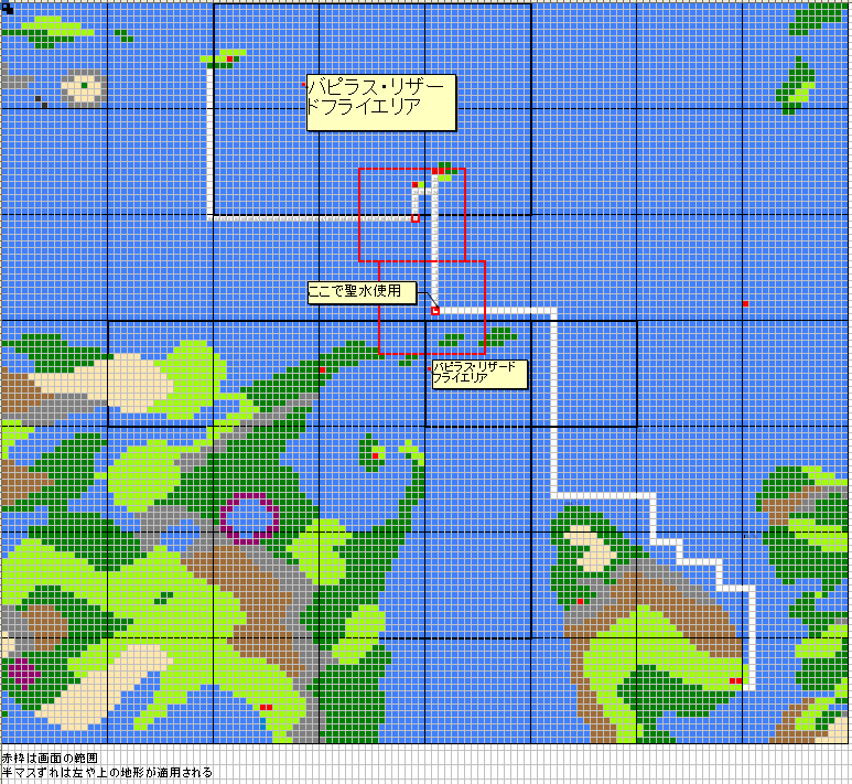 自分でマッピングしたフィールドマップに、遠藤さんのサイトにあったエンカウントエリアと、出現モンスターのリストを対応させたもの